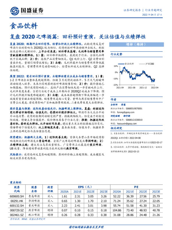 【国盛证券】【20220417】食品饮料复盘2020之啤酒篇:回补预计重演,关注估值与业绩弹性-11页 行业研究