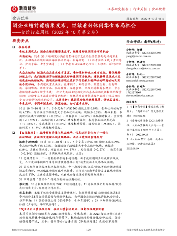 【浙商证券】【20221016】食饮行业周报(2022年10月第2期):酒企业绩前瞻密集发布,继续看好休闲零食布局机会-20页 行业研究