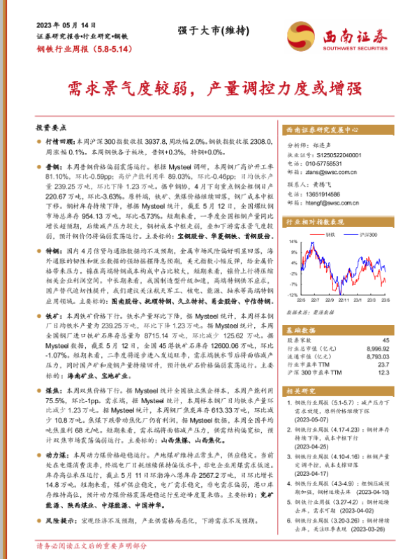 【西南证券】【20230515】20230515-西南证券-钢铁行业周报:需求景气度较弱,产量调控力度或增强-16页 行业研究