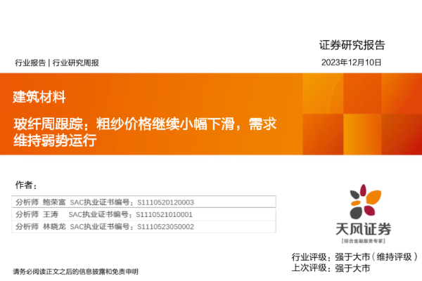 【天风证券】【20231210】玻纤周跟踪:粗纱价格继续小幅下滑,需求维持弱势运行-19页 行业研究