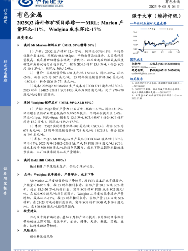 【华福证券】【20250804】2025Q2海外锂矿项目跟踪——MRL_Marion产量环比-11_Wodgina成本环比-17-2页 行业研究