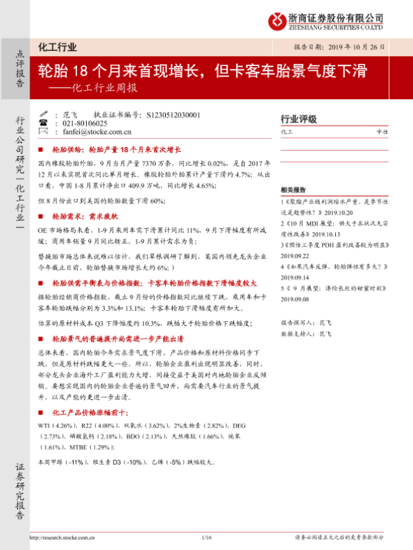 【浙商证券】【20191026】20191026-浙商证券-化工行业周报:轮胎18个月来首现增长,但卡客车胎景气度下滑-16页 行业研究