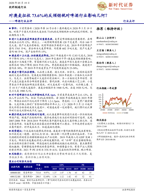 【新时代证券】【20200519】对澳麦征收73.6%的反倾销税对啤酒行业影响几何?-5页 行业研究