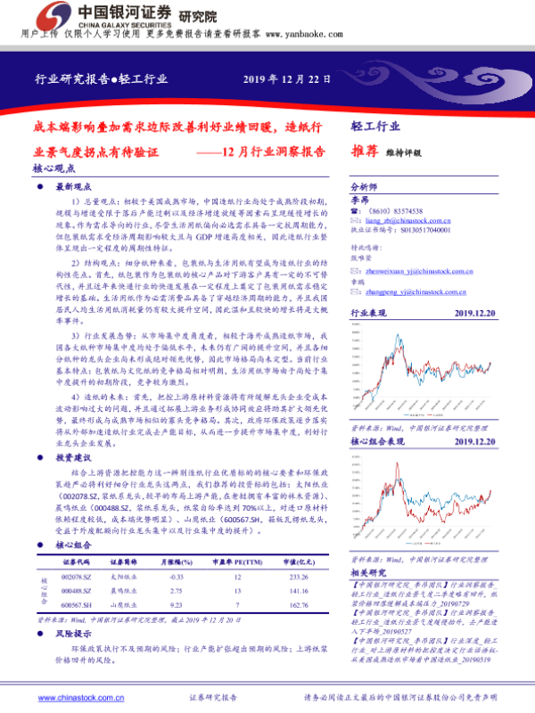 【银河证券】【20191222】轻工行业12月行业洞察报告:成本端影响叠加需求边际改善利好业绩回暖,造纸行业景气度拐点有待验证-24页 行业研究