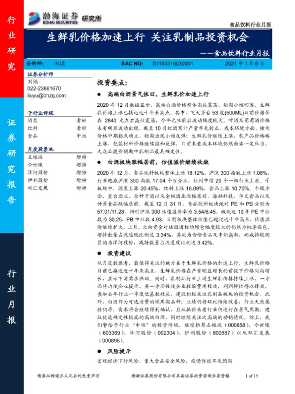 【渤海证券】【20210106】食品饮料行业月报:生鲜乳价格加速上行 关注乳制品投资机会-15页 行业研究