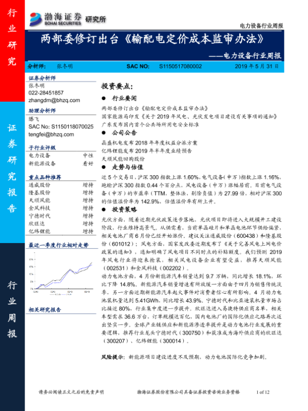 【渤海证券】【20190531】电力设备行业周报:两部委修订出台《输配电定价成本监审办法》-12页 行业研究
