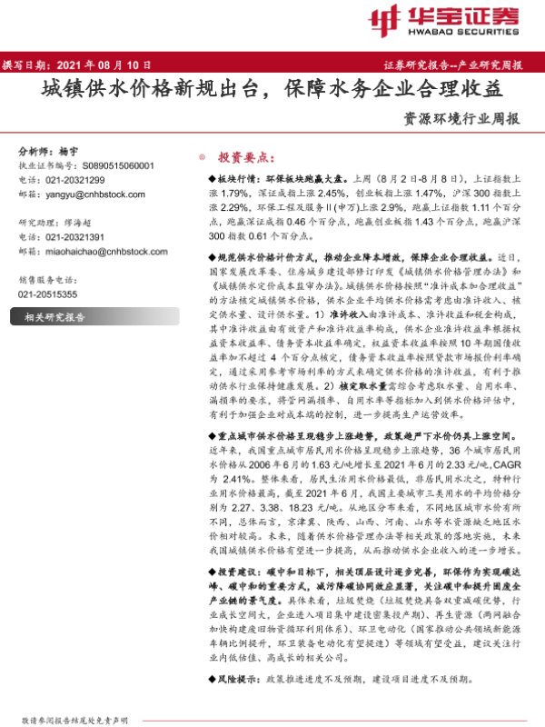 【华宝证券】【20210810】城镇供水价格新规出台,保障水务企业合理收益-10页 行业研究