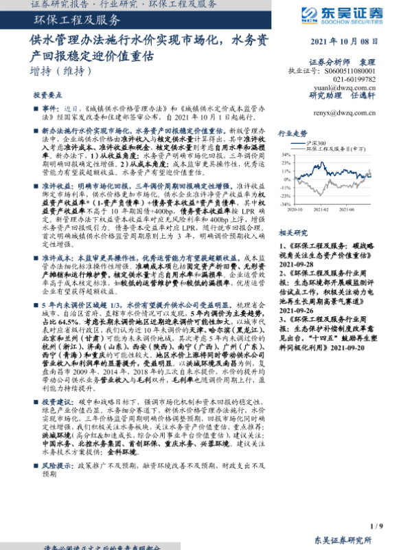 【东吴证券】【20211008】供水管理办法施行水价实现市场化,水务资产回报稳定迎价值重估-9页 行业研究