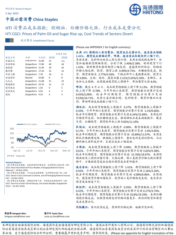 【海通国际】【20230405】HTI消费品成本指数:棕榈油、白糖价格大涨,行业成本走势分化-16页 行业研究