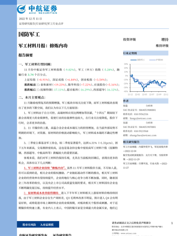 【中航证券】【20221211】军工材料月报:修炼内功-18页 行业研究