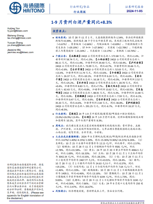【海通国际】【20241105】20241105-海通国际-食品行业周报:1-9月贵州白酒产量同比+8.3%-24页 行业研究