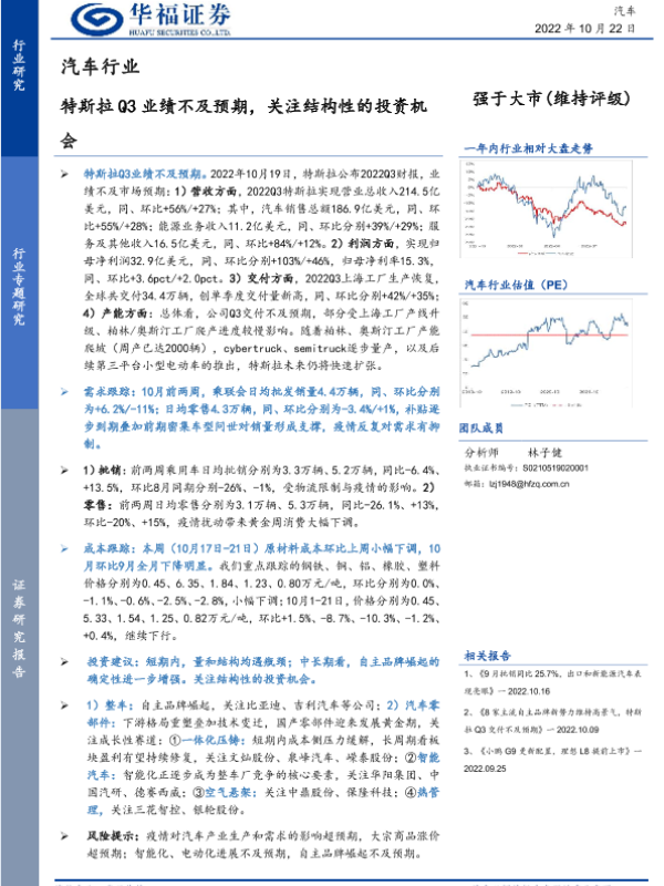 【华福证券】【20221022】20221022-华福证券-汽车行业专题研究:特斯拉Q3业绩不及预期,关注结构性的投资机会-10页 行业研究