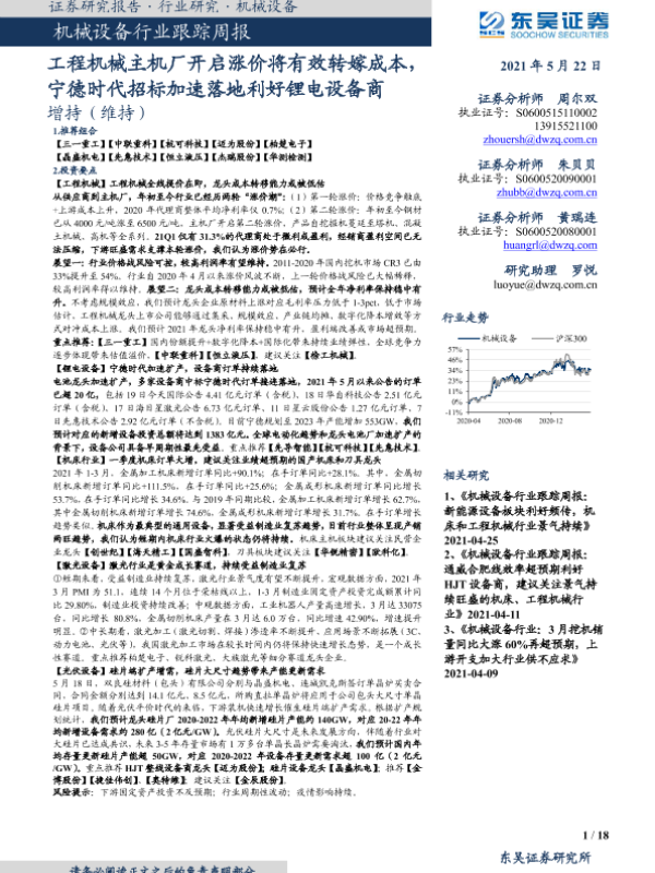 【东吴证券】【20210522】20210522-东吴证券-机械设备行业跟踪周报:工程机械主机厂开启涨价将有效转嫁成本,宁德时代招标加速落地利好锂电设备商-18页 行业研究