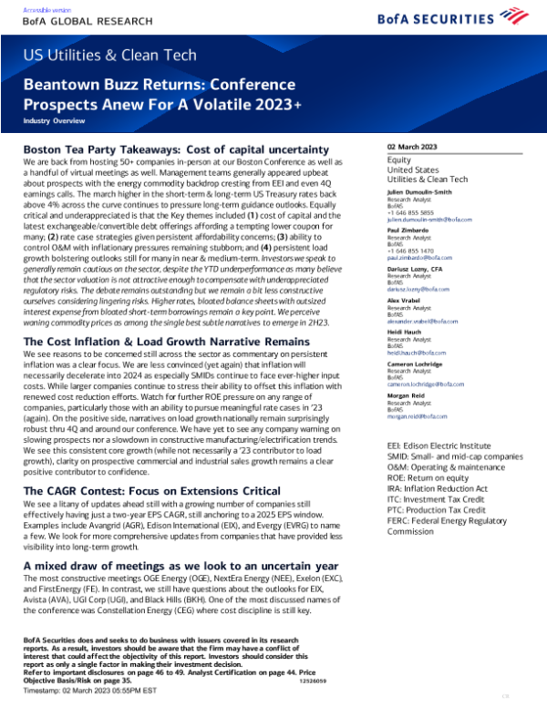 【BofA Securities】【20230302】US Utilities & Clean Tech Beantown Buzz Returns Conference Prospects Anew For A Volatile 2023+-49页 行业研究
