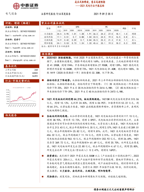 【中泰证券】【20210905】电气设备行业2021风电行业中报总结:成本风险释放,需求或超预期-23页 行业研究