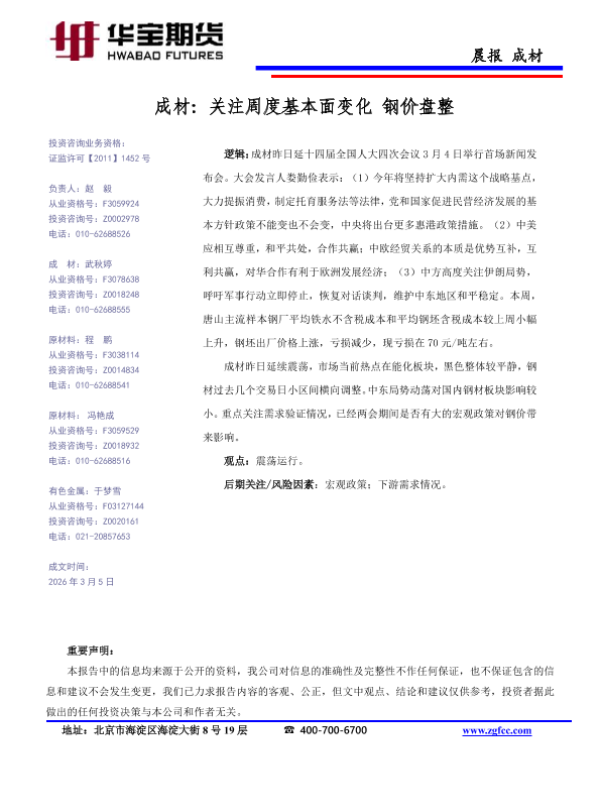 【华宝期货】【202603】成材_关注周度基本面变化_钢价盘整-1页 证券期货研究报告