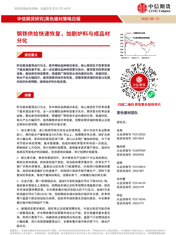 【中信期货】【202409】黑色建材策略日报:钢铁供给快速恢复,加剧炉料与成品材分化-16页 证券期货研究报告