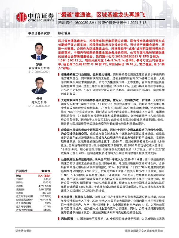 【中信证券】【20210715】20210715-中信证券-四川路桥-600039.SH-投资价值分析报告:“蜀道”建通途,区域基建龙头再腾飞-41页 行业研究