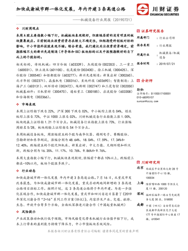 【川财证券】【20190721】机械设备行业周报:加快成渝城市群一体化发展,年内开建3条高速公路-9页 行业研究
