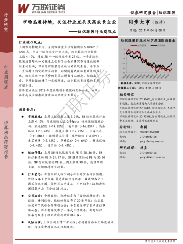 【万联证券】【20190408】20190408-万联证券-纺织服装行业周观点:市场热度持续,关注行业龙头及高成长企业-10页 行业研究