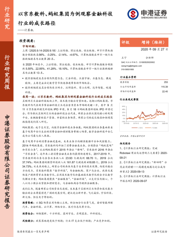 【申港证券】【20200927】20200927-申港证券-计算机行业研究周报:以京东数科、蚂蚁集团为例观察金融科技行业的成长路径-12页 行业研究