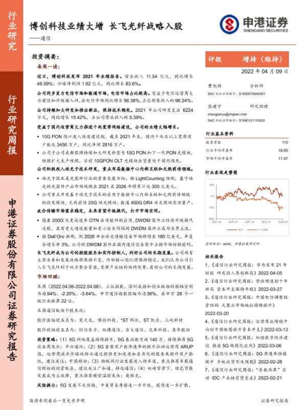 【申港证券】【20220409】20220409-申港证券-通信行业研究周报:博创科技业绩大增 长飞光纤战略入股-10页 行业研究