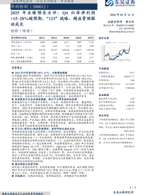 【东吴证券】【202601】2025年业绩预告点评:Q4归母净利润 +15~20%超预期,“123”战略、精益管理驱动成长-3页 证券期货研究报告