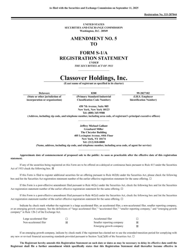 【Classover Holdings&Inc.】【202509】Classover Holdings, Inc. (KIDZ, KIDZW) 美股招股说明书 S-1 (205-09-11修订版) (英文版).pdf-215页 招股书