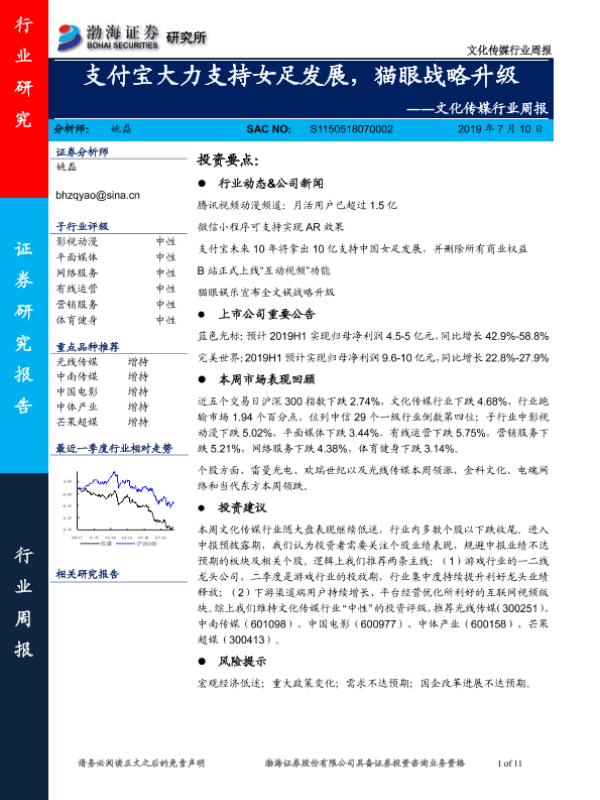 【渤海证券】【20190710】20190710-渤海证券-文化传媒行业周报:支付宝大力支持女足发展,猫眼战略升级-11页 行业研究