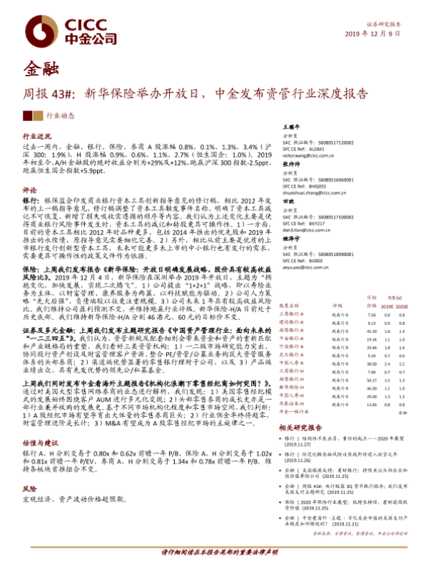 【中金公司】【20191209】金融周报43#:新华保险举办开放日,中金发布资管行业深度报告-14页 行业研究