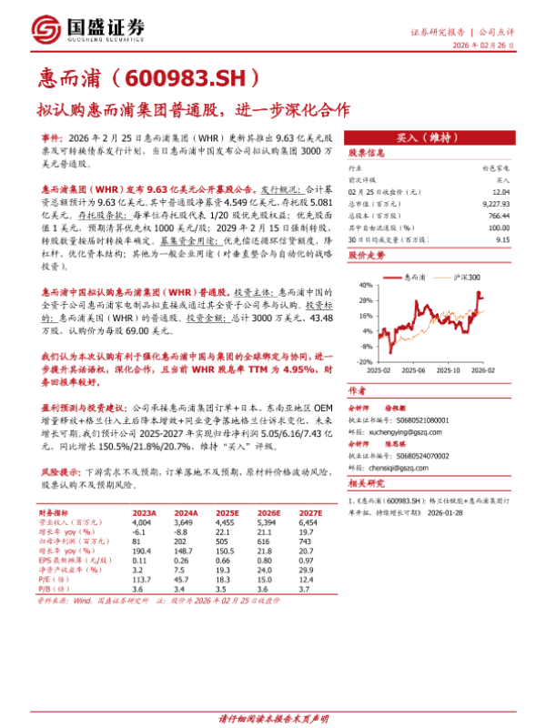 【国盛证券】【202602】拟认购惠而浦集团普通股,进一步深化合作-3页 证券期货研究报告