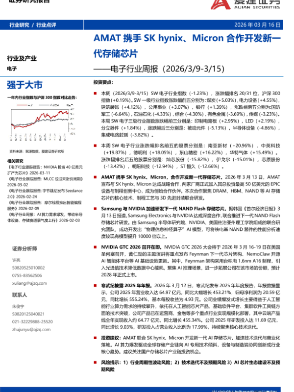 【爱建证券】【202603】电子行业周报:AMAT携手 SK hynix、Micron合作开发新一代存储芯片-8页 证券期货研究报告