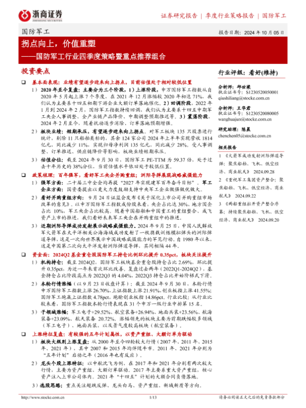 【浙商证券】【20241005】国防军工行业四季度策略暨重点推荐组合:拐点向上,价值重塑-13页 行业研究