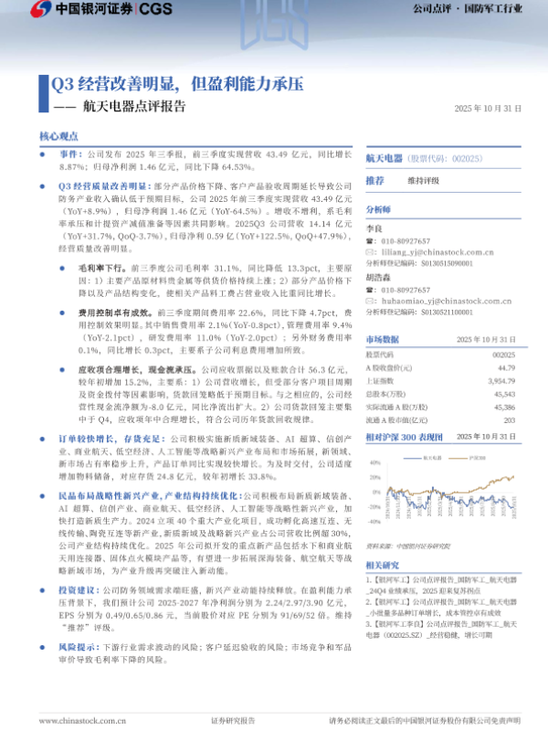 【银河证券】【202510】Q3经营改善明显,但盈利能力承压——航天电器点评报告-4页 证券期货研究报告