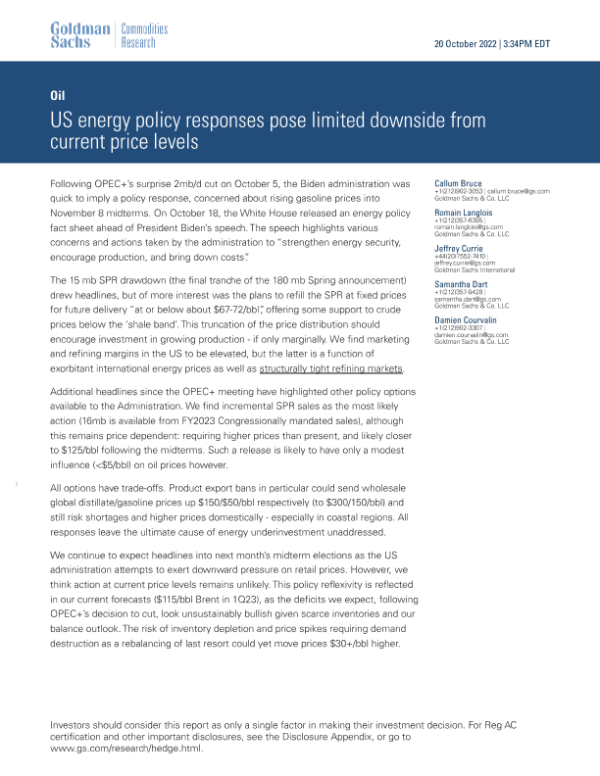 【Goldman Sachs】【20221020】US energy policy responses pose limited downside from current price levels-13页 行业研究