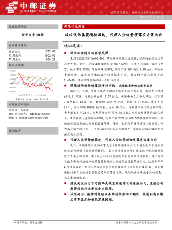 【中邮证券】【20220523】保险行业周报:板块低估屡获增持回购,代理人分级管理落实方案出台-18页 行业研究