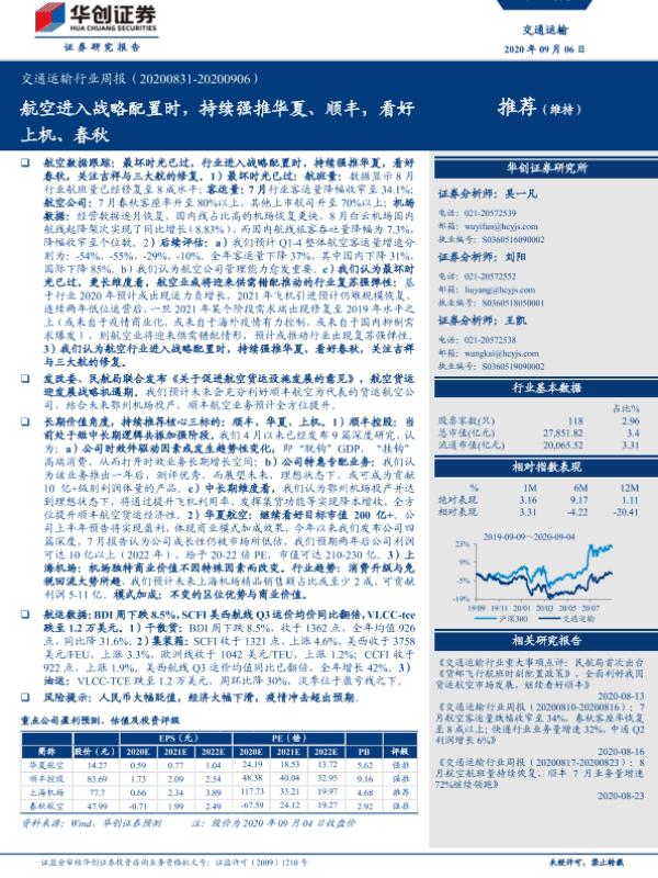 【华创证券】【20200906】交通运输行业周报:航空进入战略配置时,持续强推华夏、顺丰,看好上机、春秋-18页 行业研究