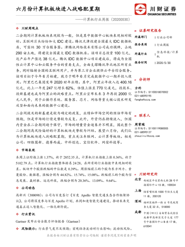 【川财证券】【20200530】20200530-川财证券-计算机行业周报:六月份计算机板块进入战略配置期-10页 行业研究