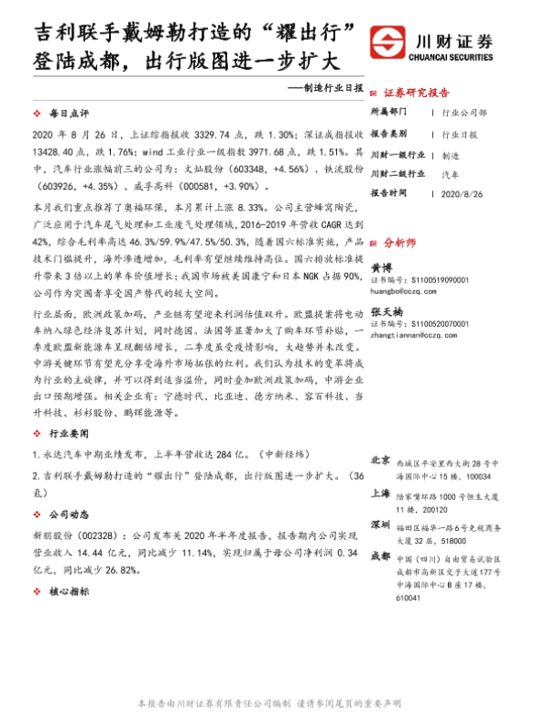 【川财证券】【20200826】制造行业日报:吉利联手戴姆勒打造的“耀出行”登陆成都,出行版图进一步扩大-3页 证券期货研究报告