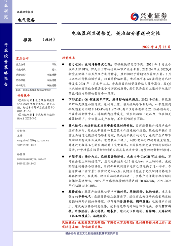 【兴业证券】【20220422】电池盈利显著修复,关注细分赛道确定性-34页 行业研究