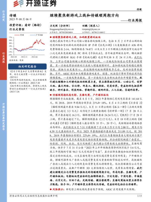 【开源证券】【20230806】传媒行业周报:继续聚焦新游戏上线和传媒顺周期方向-15页 行业研究