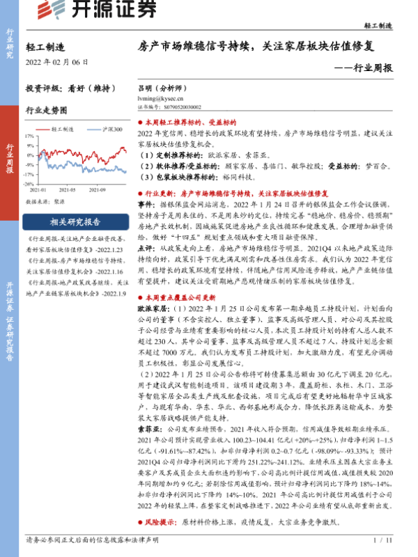 【开源证券】【20220206】20220206-开源证券-轻工制造行业周报:房产市场维稳信号持续,关注家居板块估值修复-11页 行业研究