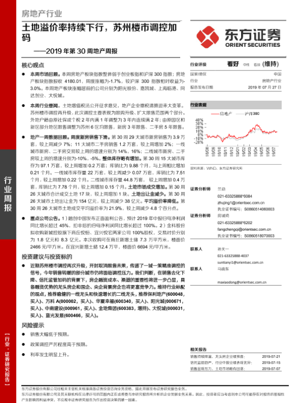 【东方证券】【20190727】2019年第30周地产周报:土地溢价率持续下行,苏州楼市调控加码-18页 行业研究