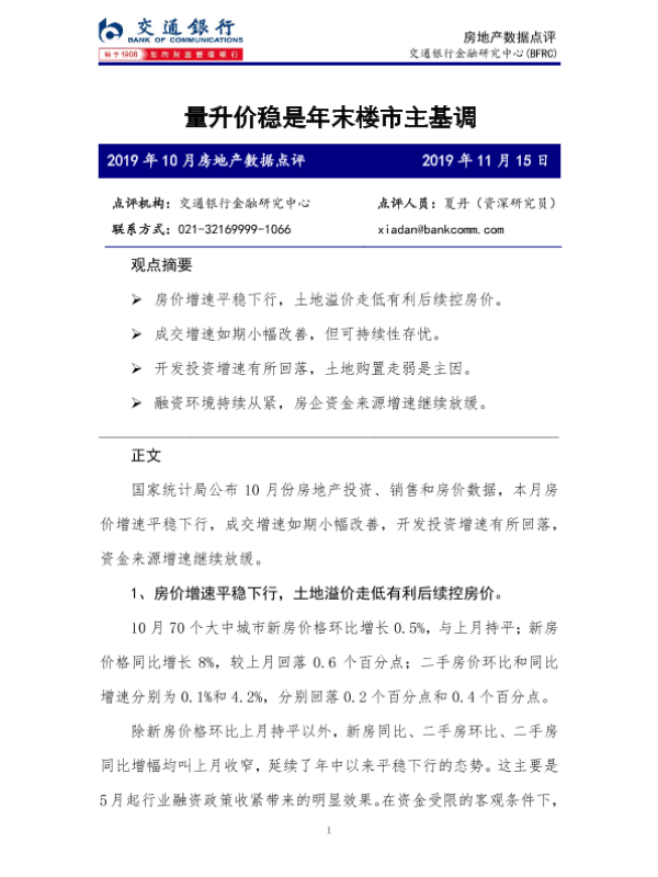 【交通银行金融研究中心】【20191115】2019年10月房地产数据点评:量升价稳是年末楼市主基调-6页 行业研究