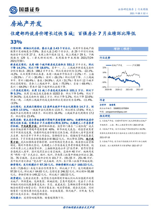 【国盛证券】【20210802】住建部约谈房价增长过快5城;百强房企7月业绩环比降低33%-25页 行业研究