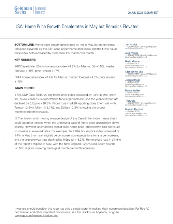 【Goldman Sachs】【20220726】USA Home Price Growth Decelerates in May but Remains Elevated-2页 行业研究