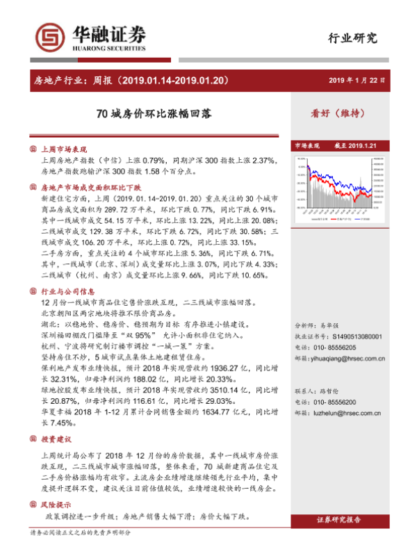 【华融证券】【20190122】房地产行业:周报-70城房价环比涨幅回落-12页 行业研究