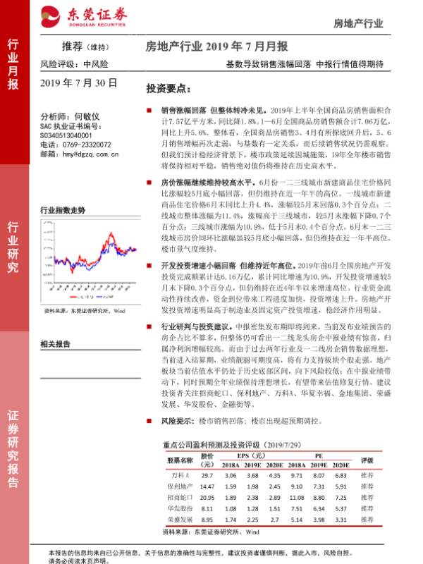 【东莞证券】【20190730】房地产行业2019年7月月报:基数导致销售涨幅回落 中报行情值得期待-12页 行业研究