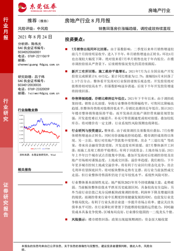 【东莞证券】【20210824】房地产行业8月月报:销售回落房价涨幅趋缓,调控成效持续显现-13页 行业研究