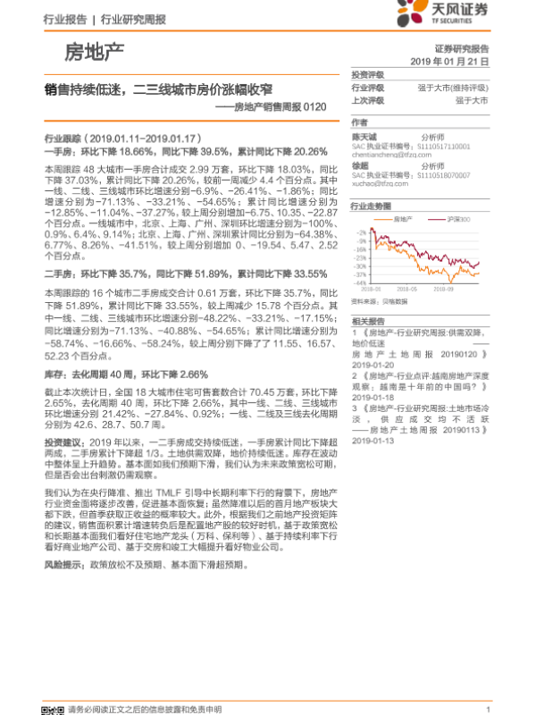 【天风证券】【20190121】销售持续低迷,二三线城市房价涨幅收窄-17页 行业研究